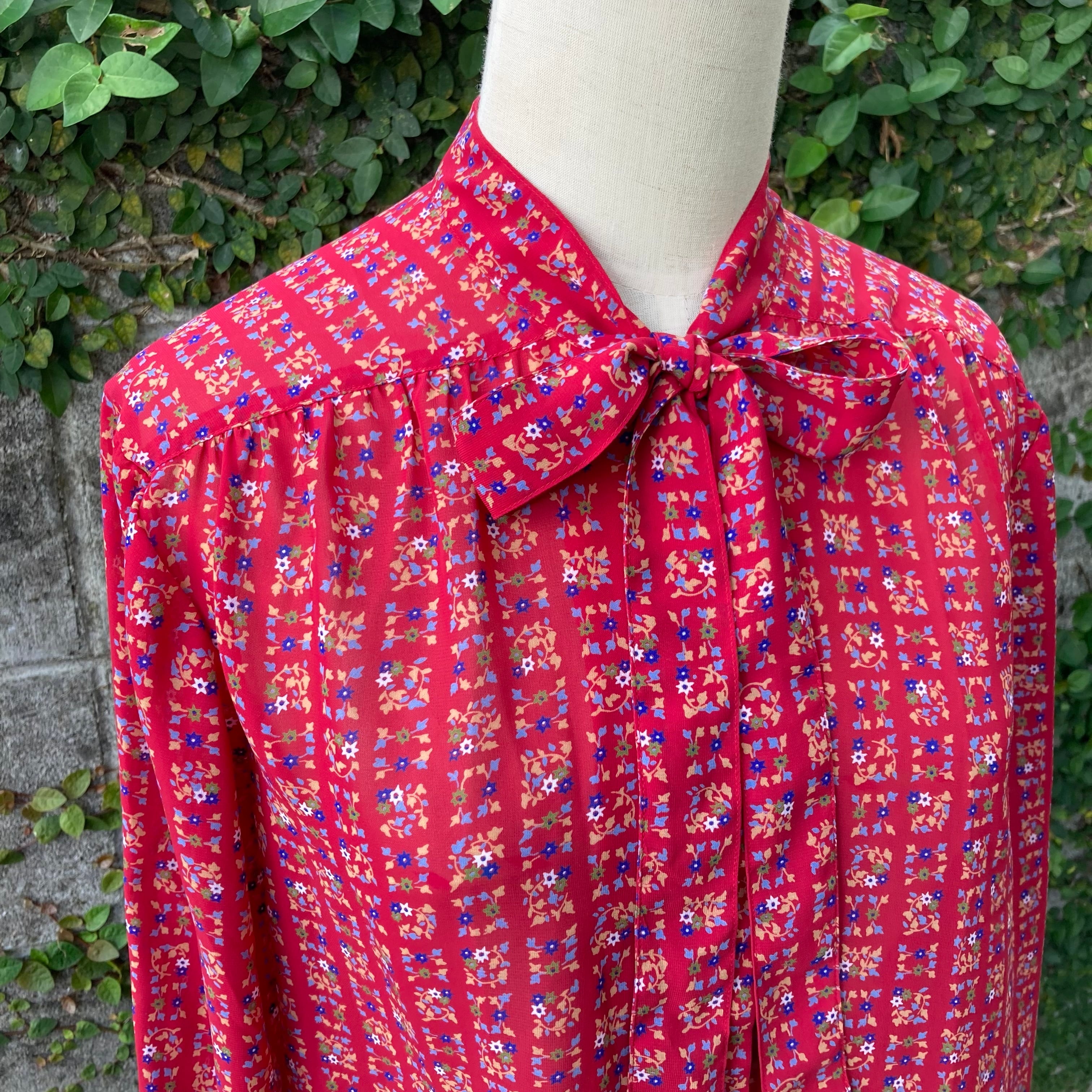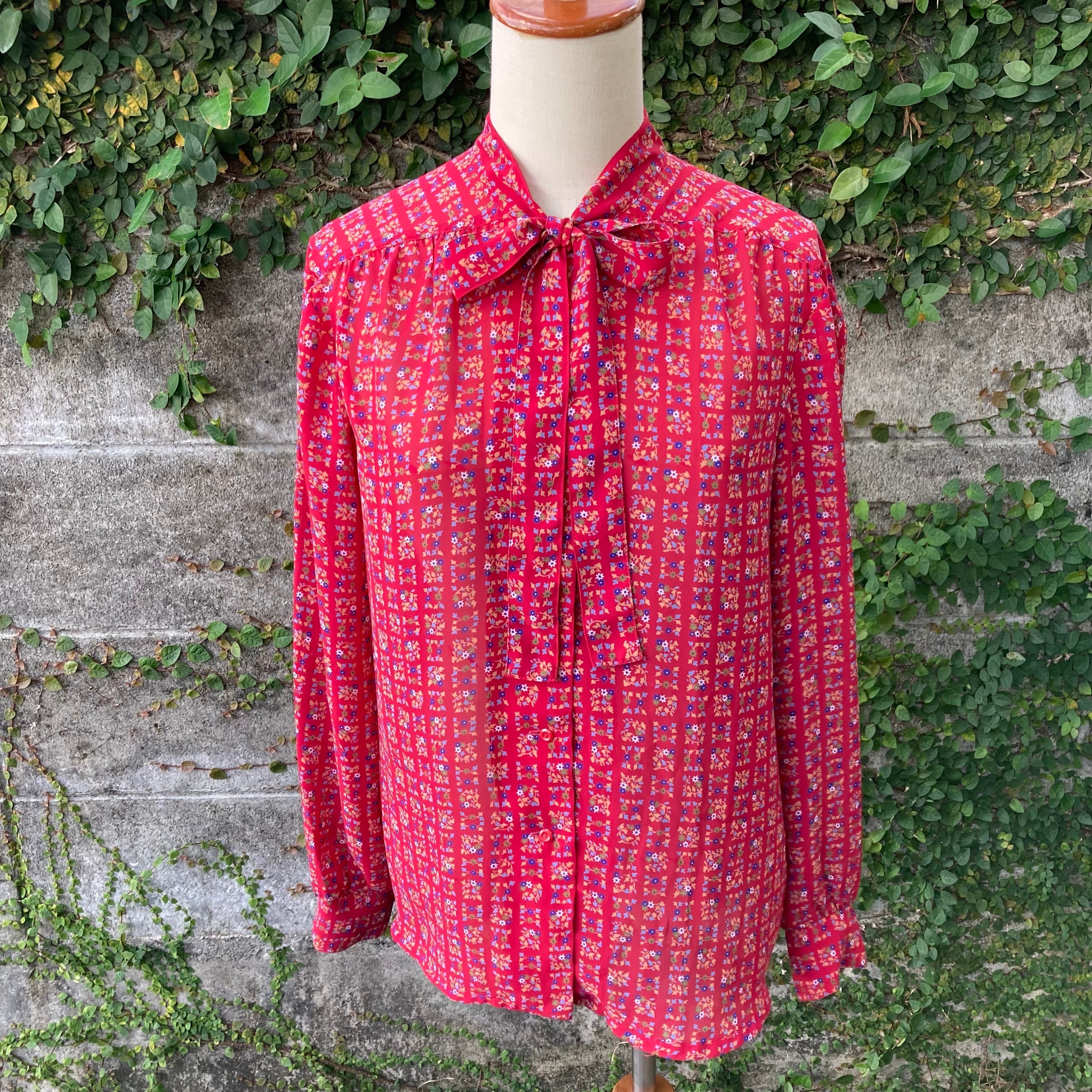 こちらのボウ・ブラウスは、まるで昭和の包装紙のデザインのようなお花がキュートなデザインになっています。