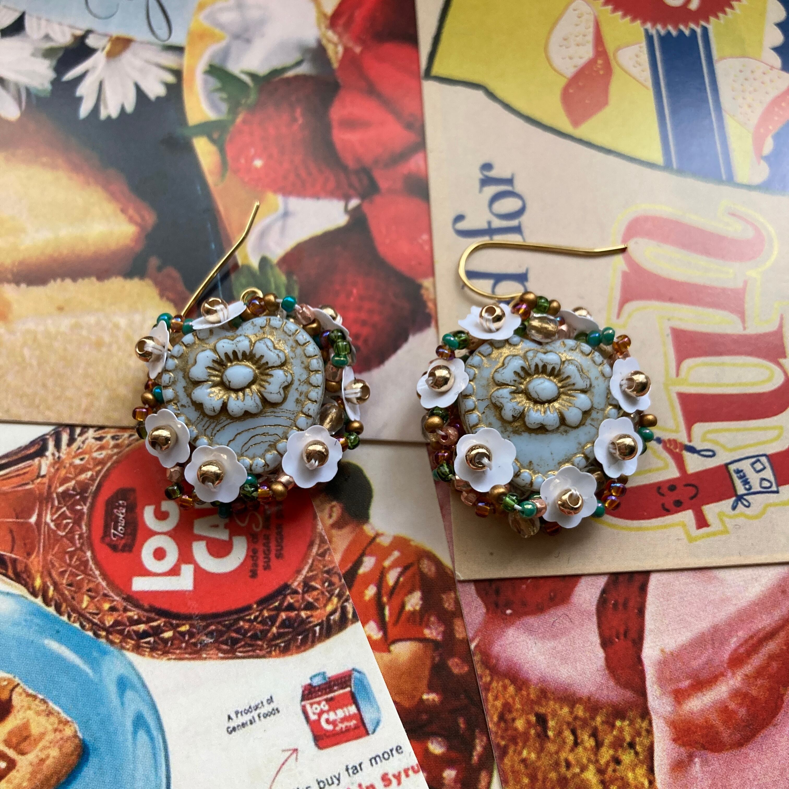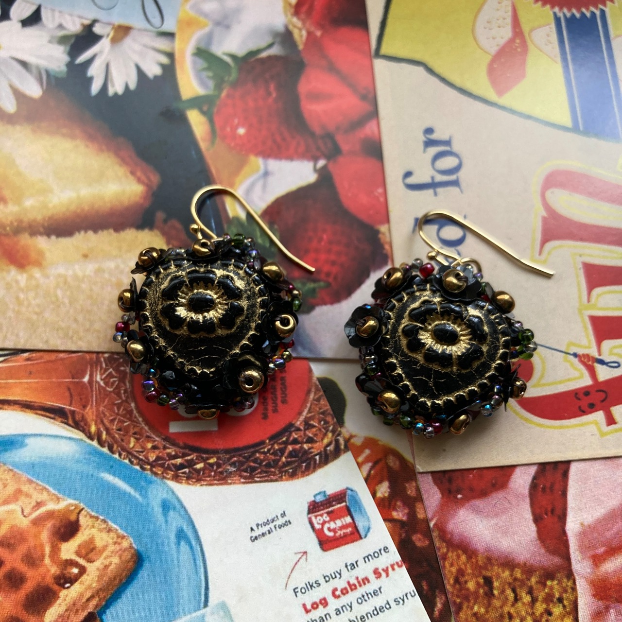 プレゼント箱のように華やかなビーズ刺繍のまん丸ブーケ。